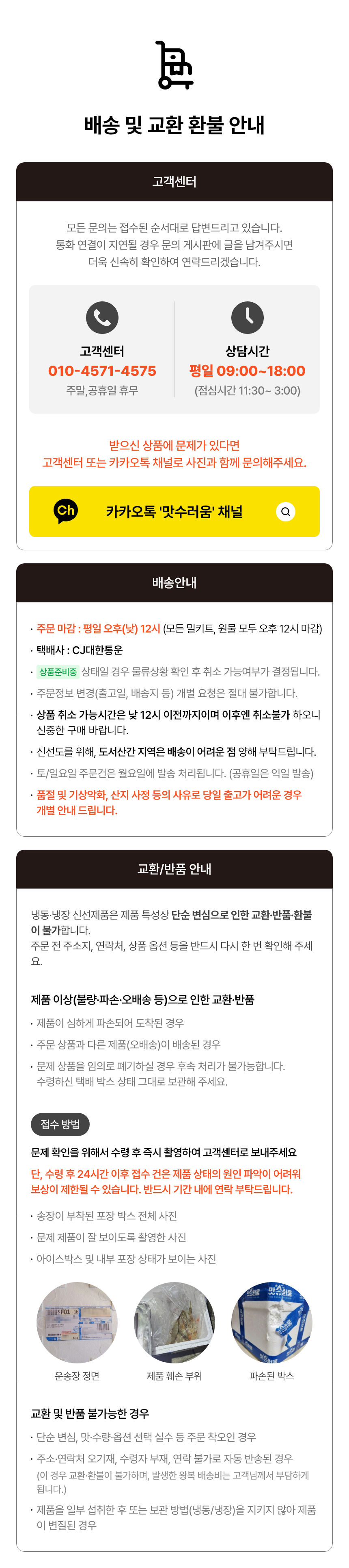 상품 이상시 제품 상태를 확인할 수 있는 사진과 함께 고객센터로 문의주시면 조치해드리겠습니다. (고객센터 운영시간 : 평일 09:00~18:00 / 점심시간 11:30~12:30)
